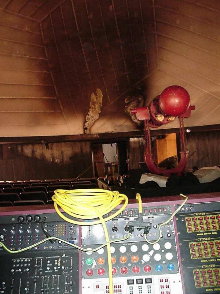 The picture to the right (or below) was provided courtesy of Brett Jacobs. This was the original Bishop Planetarium right after an unfortunate fire destroyed the theater. In this picture, the lower left-hand corner shows an original P-4 Analog Console. This console was thrown away with the rest of the contents of the theater.
