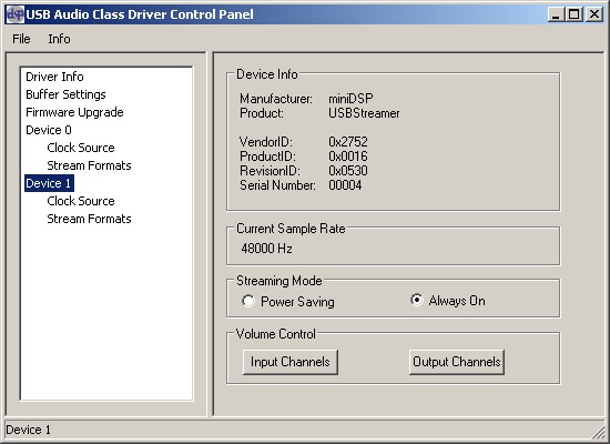 Next we will need to prepare the USBStreamers for 16 channel output. By default, the USBStreamers will have a serial number of 1 if in I2S mode or 3 if in ADAT mode. If running in ADAT mode, we want to load new firmware to one of the USBStreamers so it will have a serial number of 4. First go to the firmware update tab and select browse, find the folder containing the firmware updates for the USBStreamer, select the ADAT version and you will find 2 files, one for ID3 and one for ID4. Select ID4 and start the firmware update with only 1 USBStreamer attached.