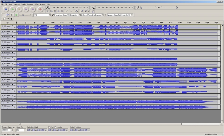 The first step is to create the 16 channel wave file. In the image below, you will see a total of 16 tracks. I first opened an 8 channel wave file, then added the additional 8 channels from a second show.