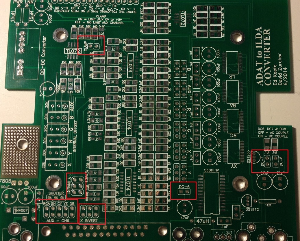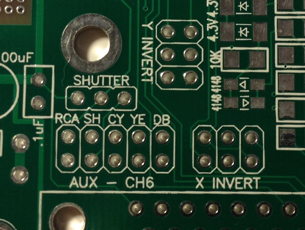 Here you can see a cluster of 4 pin headers. Shutter should be wired to a SPDT switch, X and Y invert should be wired to a DPDT switch. The last pin header is a 2x5. Setting a jumper here will define the output of Auxilliary channel 6. This can be set for the external RCA jack, Shutter (ILDA pin 13), Cyan (ILDA pin 10), Yellow (ILDA pin 9) or Deep Blue (ILDA pin 8).