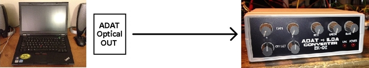 The ADAT to ILDA Converter can be connected to a PC IF the PC has an "ADAT OUT" port. There are a few PCI and PCIe adapters that have ADAT IN and OUT ports. For something a little more portable, we recommend the MiniDSP USBStreamer, which is a very small, USB powered device that supports ADAT IN and OUT for both recording and playback of show material. More information on the MiniDSP USBStreamer can be found here: MiniDSP USBStreamer. The ADAT to ILDA Converter has also been tested with a Macbook Pro running Mavericks with the MiniDSP USBStreamer and performed flawlessly!