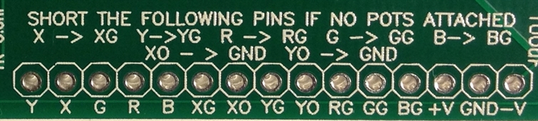 If you do not wish to connect potentiometers to the circuit board, you will need to short the specific pins above. If you do not short, or connect these pins to a potentiometer, no signal will be present on the ILDA connector. X, Y, R, G and B connect to one side of the potentiometer while XG, YG, RG, GG, and BG connect to the wiper of a potentiometer. For the position offset potentiometers, connect +V and -V to either side and XO and YO to the wiper of the potentiometer. 50K potentiometers are recommended.