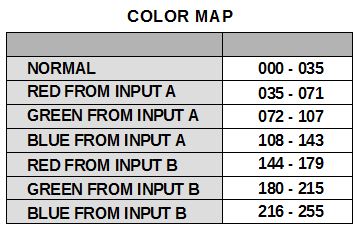 Color Mapping in Dual Input Router mode allows the ability to map any output to either the A or B input. If you wanted the green output of projector 5 to map to the blue from input B, simply set the DMX value to anything between 216 and 255.