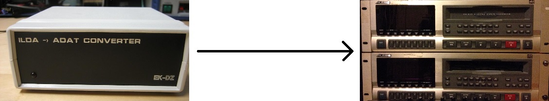 The ILDA to ADAT Converter can be directly connected to the ADAT to ILDA Converter. The only real benefit of this is complete electrical isolation since the show material is being transmitted optically. Optical cables of up to 25' have been successfully tested. No configuration is required, plug and play!