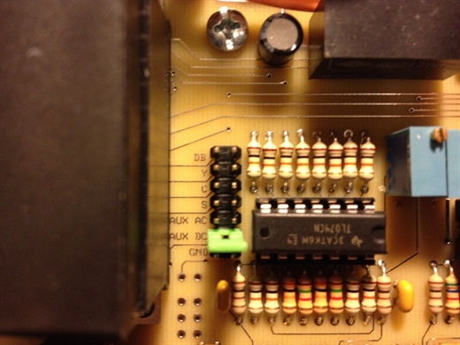 Within the ILDA to ADAT Converter, there is a 2x7 pin header. A jumper placed here will set the mode of the Auxilliary channel. By default, the jumper will be set to "GND" or ground, preventing any signal from being recorded. If you plan on using the RCA jack on the rear of the converter, you will need to set this jumper to either AUX AC or AUX DC. AUX AC allows only an AC signal to be recorded, such as audio. AUX DC allow for direct DC coupling, typically not suitable for audio and can be used to record SMPTE time code.