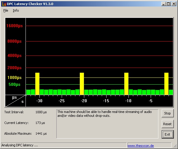 The screen shot below is an example of the Latency Checker. I spent some time researching the cause of the yellow spikes and it turned out to be a flaw in the Wifi Driver on my specific laptop. A fix was never created for it. DIsabling the Wifi eliminates the spikes. However, even with the Wifi enabled, I am able to record and playback shows without any issue. Spikes in the red would be more concerning.