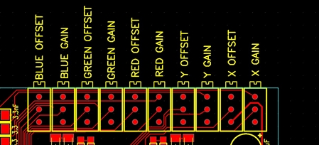 There are 10 multi-turn trim potentiometers for adjusting gain and offset for XY and RGB.
