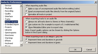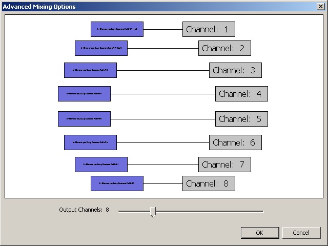 Under Audacity Preferences, select 'Import/Export'. Be sure to select 'Use Custom Mix'. This allows for multichannel wave files, otherwise your newly recorded 8 channel wave file will be mixed down to 2 channels.