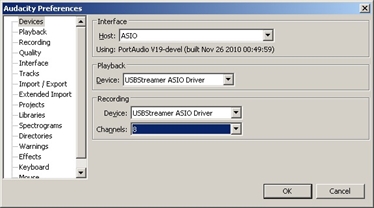 Under Audacity Preferences, select 'Devices'. For Windows, it's important that the Host is set for ASIO. On a MAC the Host is set for Core Audio. In the recording box, select the USBStreamer or other ADAT Optical compatible device and set the number of channels to 8.