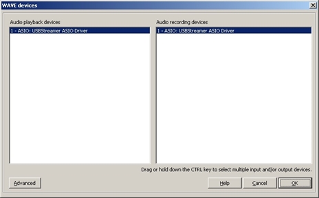 The first thing to do is to set ASIO and the USBStreamer as the playback and recording device. You may have a number of other devices on the list, mine is limited due to a setting under the advanced tab to just show the ASIO devices. Select 'Settings' then 'Audio Devices' to get to this screen to set the ASIO device.