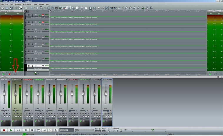 At this point, you screen may look something like the pic above. Just below the record or playback VU meter, you should see a small gear for settings. Click the gear and you will be presented with an 'Audio Format' window. From here select 'Select I/O Channels'. Place a check mark on all input and output channels.