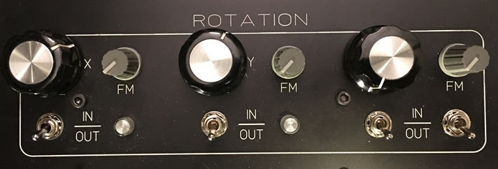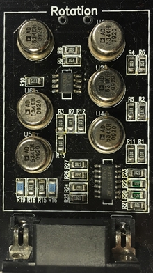 The X, Y and Z Rotation feature is a very unique function of the Z-5. Each rotator circuit requires a dedicated VCQO to handle its operation. The sine/cosine signal from the VCQO's are fed to the rotation matrix circuit, which features six AD534 analog multiplier IC's. Each rotator also has the ability to be frequency modulated via a hardwired signal fed from LFO 1.