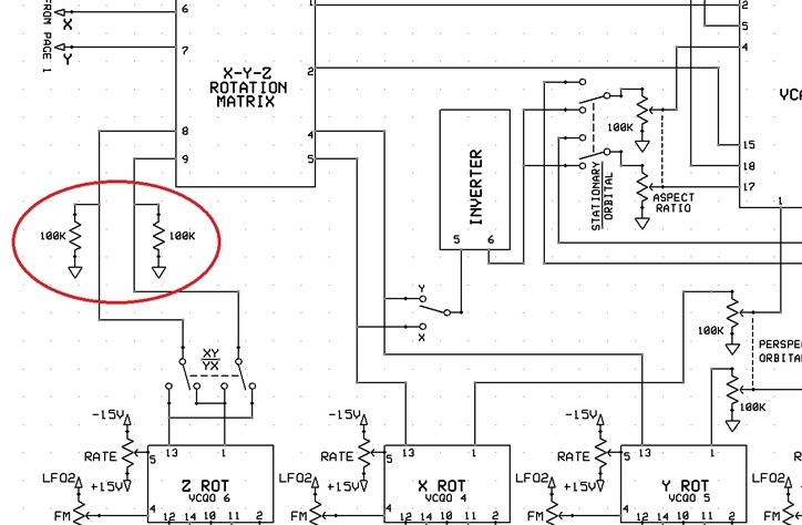 YX/XY Stability - The Z rotator has an XY to YX switch which swaps the sine/cosine signals to cause an immediate 90 degree turn of an image being displayed. The output of this switch feeds the non-inverting inputs of an op-amp. During the transition of the toggle switch these inputs float causing the scanners to quickly jump to a far corner of the scanning field. The only way to prevent this is to add two pull down 100K resistors. Instead of the beam jumping to a corner, the beam will jump to center during the transition.