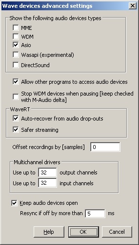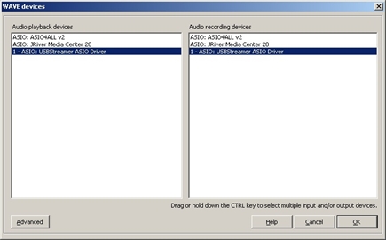 From the top, select 'Settings' then 'Audio Devices'. This will bring up a window labelled 'Wave Devices'. From here select 'Advanced'. On the 'Wave Devices Advanced Settings' window make sure 'ASIO' is checked as the audio device type. Select OK, this will take you back to the 'Wave Devices' window. Select 'ASIO: USBStreamer ASIO Driver' for both playback and recording and select OK.