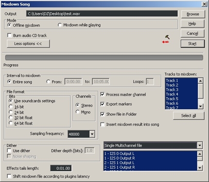 You will now see the 'Mixdown Song' window. The most important thing to do here is select the option 'Single Multichannel File' from the drop-down menu at the bottom right. Then select 'Start'. This will create an 8 channel wave file that's ready for playback!